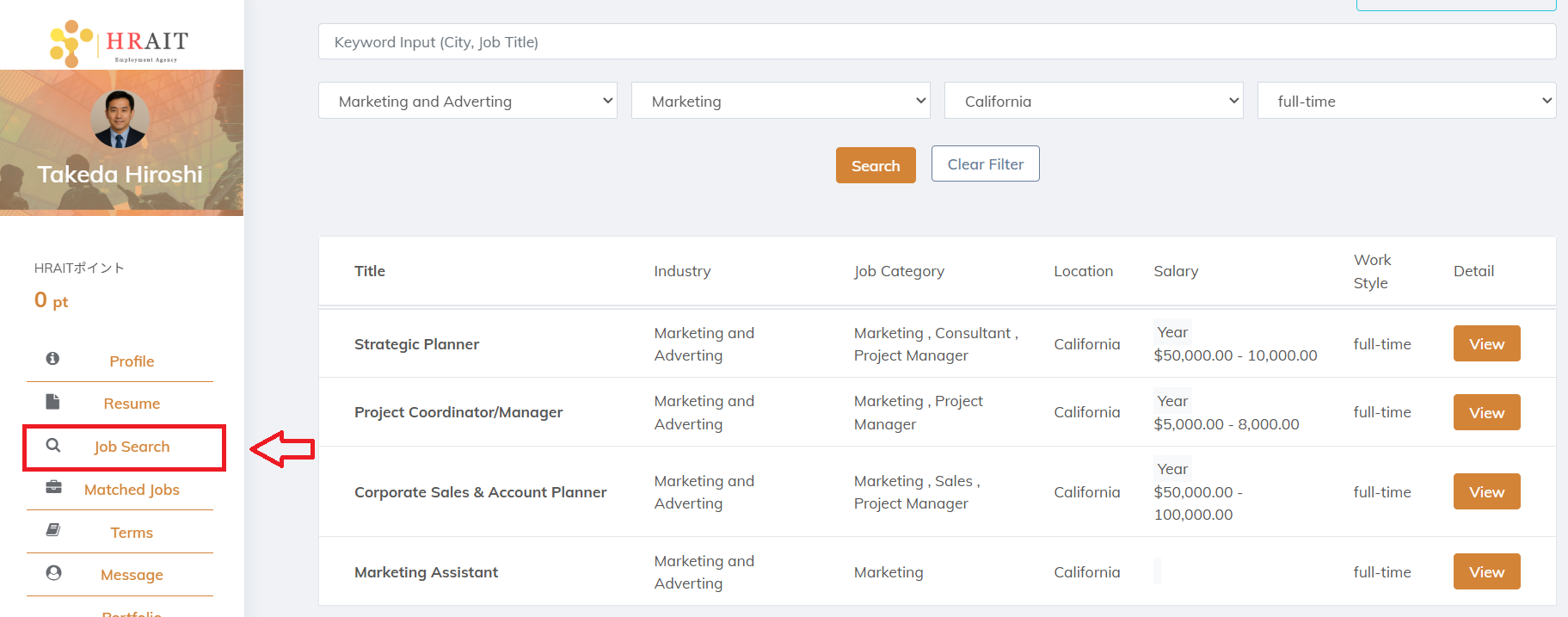 ログイン後、「Job Search」から求人を検索できます。